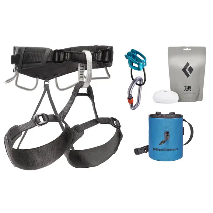 The Black Diamond Momentum 4S Combo equips you for climbing and belaying with essential gear. The package comprises a Momentum DS harness, an ATC XP belay device, a Rocklock Screwgate carabiner, BD White Gold chalk, and a Mojo chalk bag.